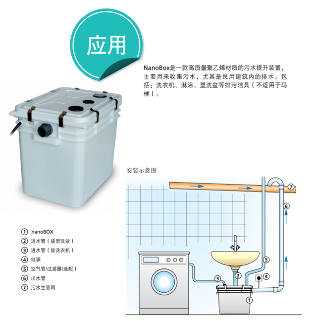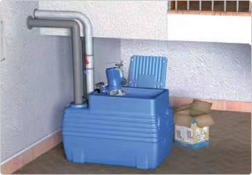 BlueBox污水提升装置适用于收集和提升清水、雨水及洗衣机、卫生间的生活污水,安装于低于市政排污管道的场所,如车库和地下室。